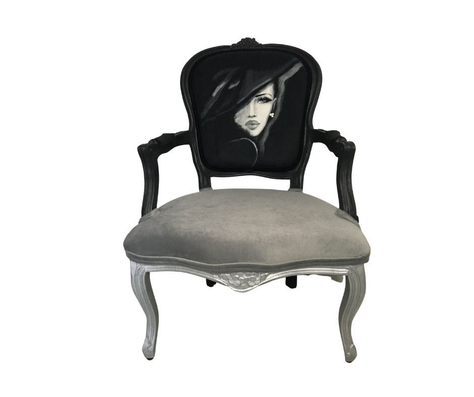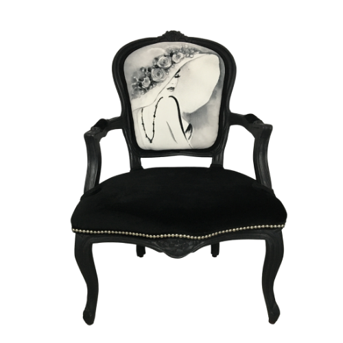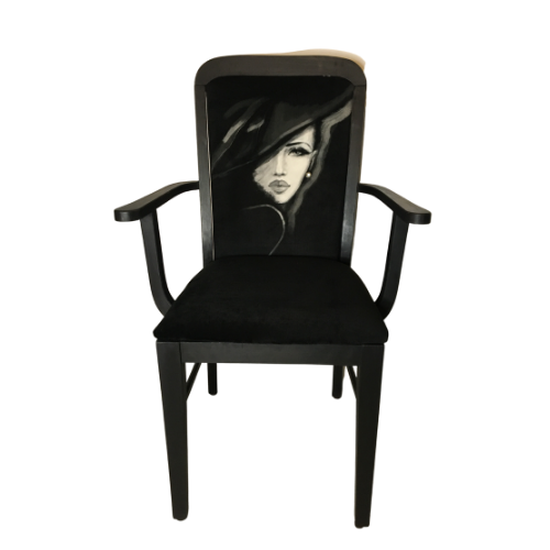Delikatnie rzeźbiony czarny fotel z siedziskiem wykończonym matowo-srebrnymi ćwiekami, grafika wykonany na zamówienie posiada zdobienia – na kapeluszu drobne delikatne srebrne koraliki, natomiast plecy kobiety zdobi ręcznie wyszywany koralikami naszyjnik.