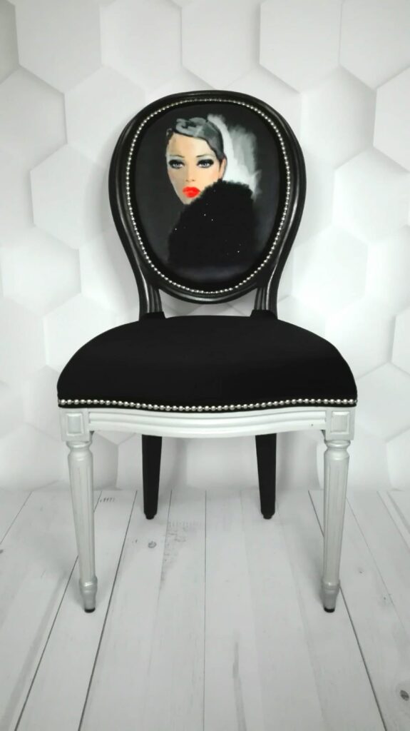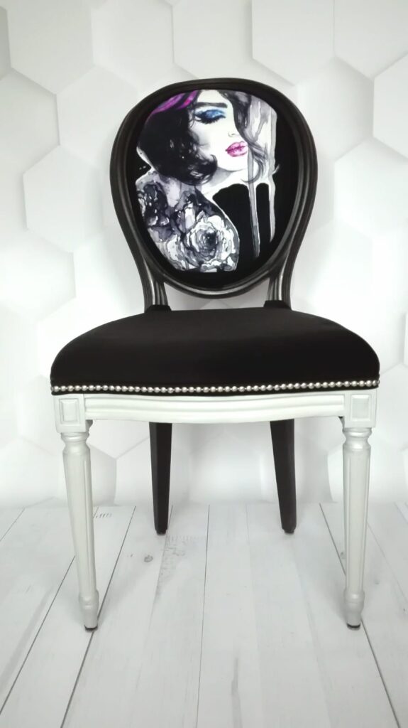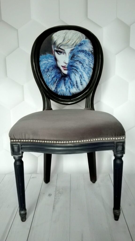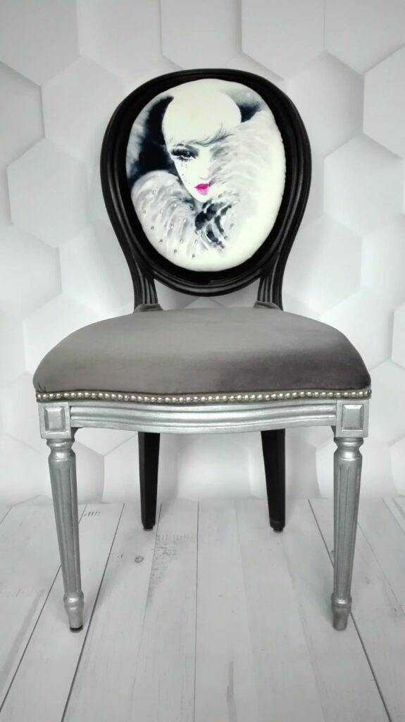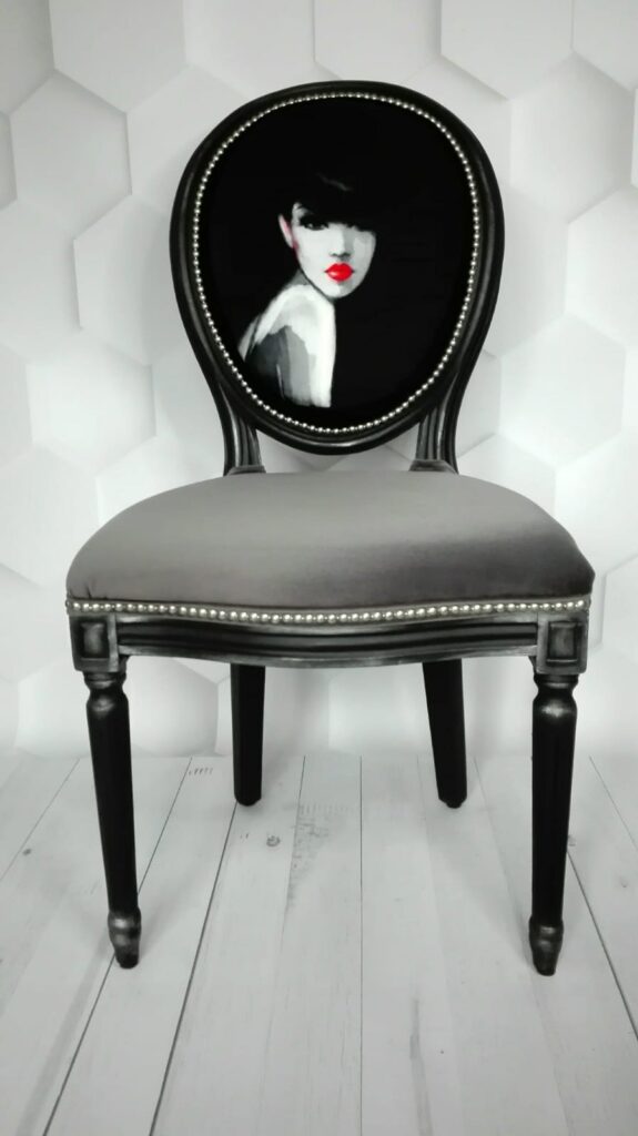 Szaro-czarne krzesło z rzeźbionymi nogami, siedzisko i oparcie zdobione matowymi, srebrnymi ćwiekami, delikatne zdobienia woskiem pozłotniczym, nadruk wykonany na zamówienie, strój kobiety ozdobiony jest ręcznie naszywanymi czarnymi koralikami.